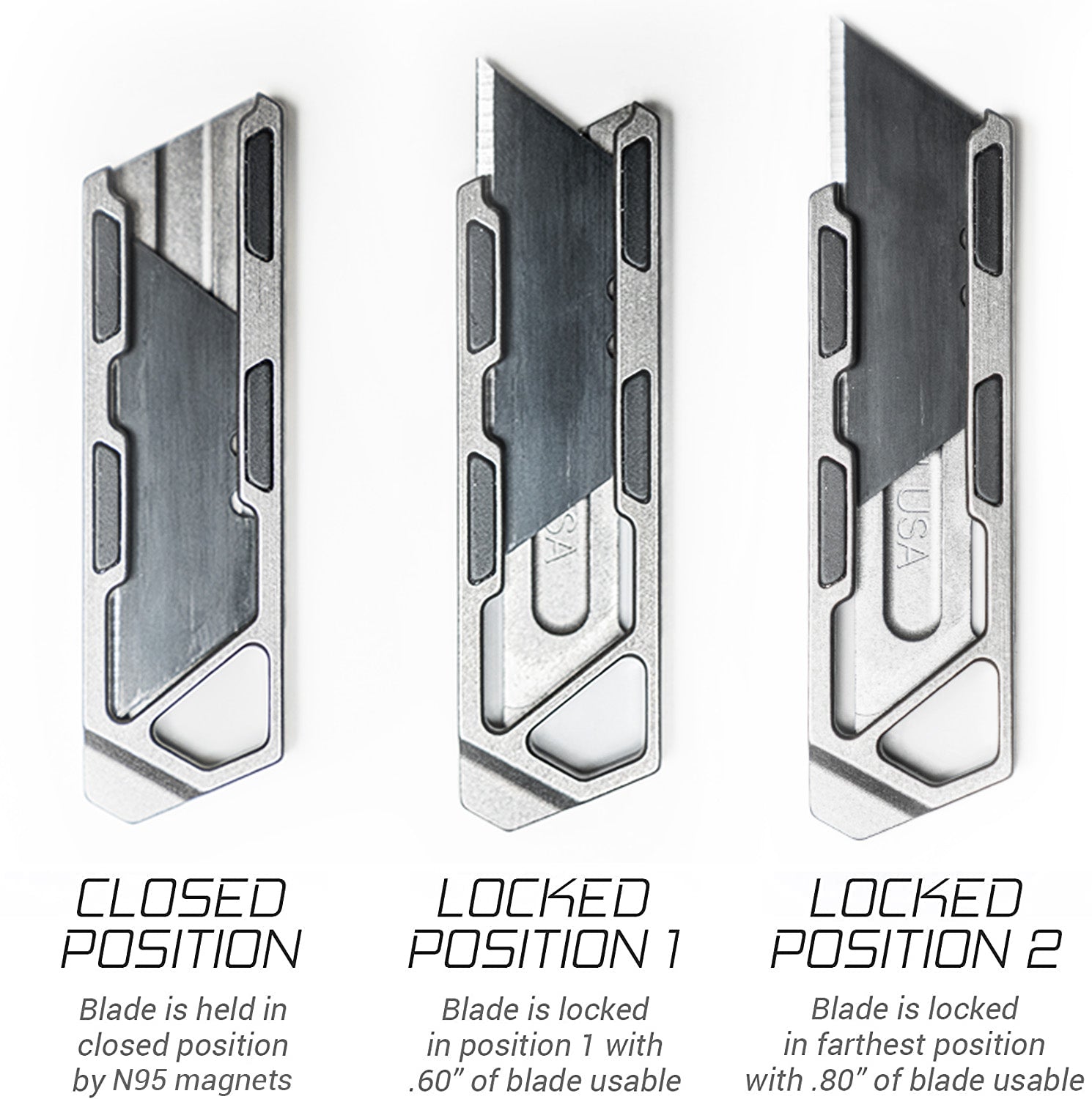 - RAZOR BLADE FITMENT — We have tested every known razor blade over the past 3 years and have created our design to fit perfectly with minimal slip factor with the average utility knife blade. We’re happy to say that our tolerances of this made-in-the-USA product are precise and you’ll notice our heightened level of quality in this USA made product as soon as you get it in your hand!