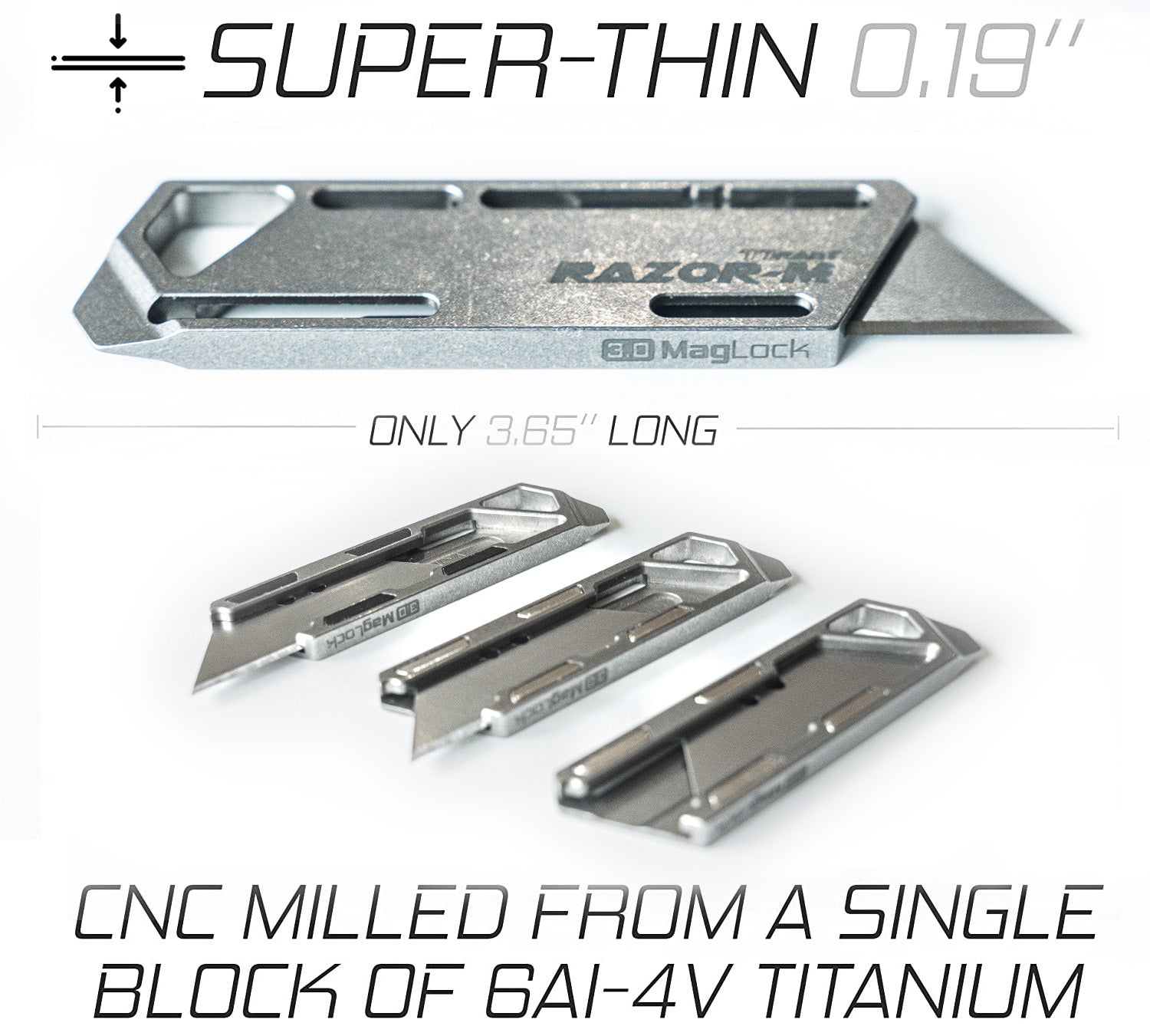 - This Exceed Designs ‘TiRant RAZOR-M 3.0 MagLock’ utility knife, (Titanium Magnetic/MagLock Utility Knife — TMUK) EDC pocket knife & pry bar is CNC milled from a solid block of 6Al-4V Titanium. The full titanium monoblock construction is built to last a lifetime and features our own custom magnetic design with 4 N52 Rare Earth Neodymium Magnets. These magnets give this one-of-a-kind utility knife a surprisingly addictive fidget factor. The ultra-light titanium design only weighs 0.6oz and nearly matches the thickness of just 2-3 home keys! This knife is available in stonewashed ti with optional magnet colors including Silver, Jet-Black and 24K Gold Coated. Each purchase includes 10X generic razor blades.