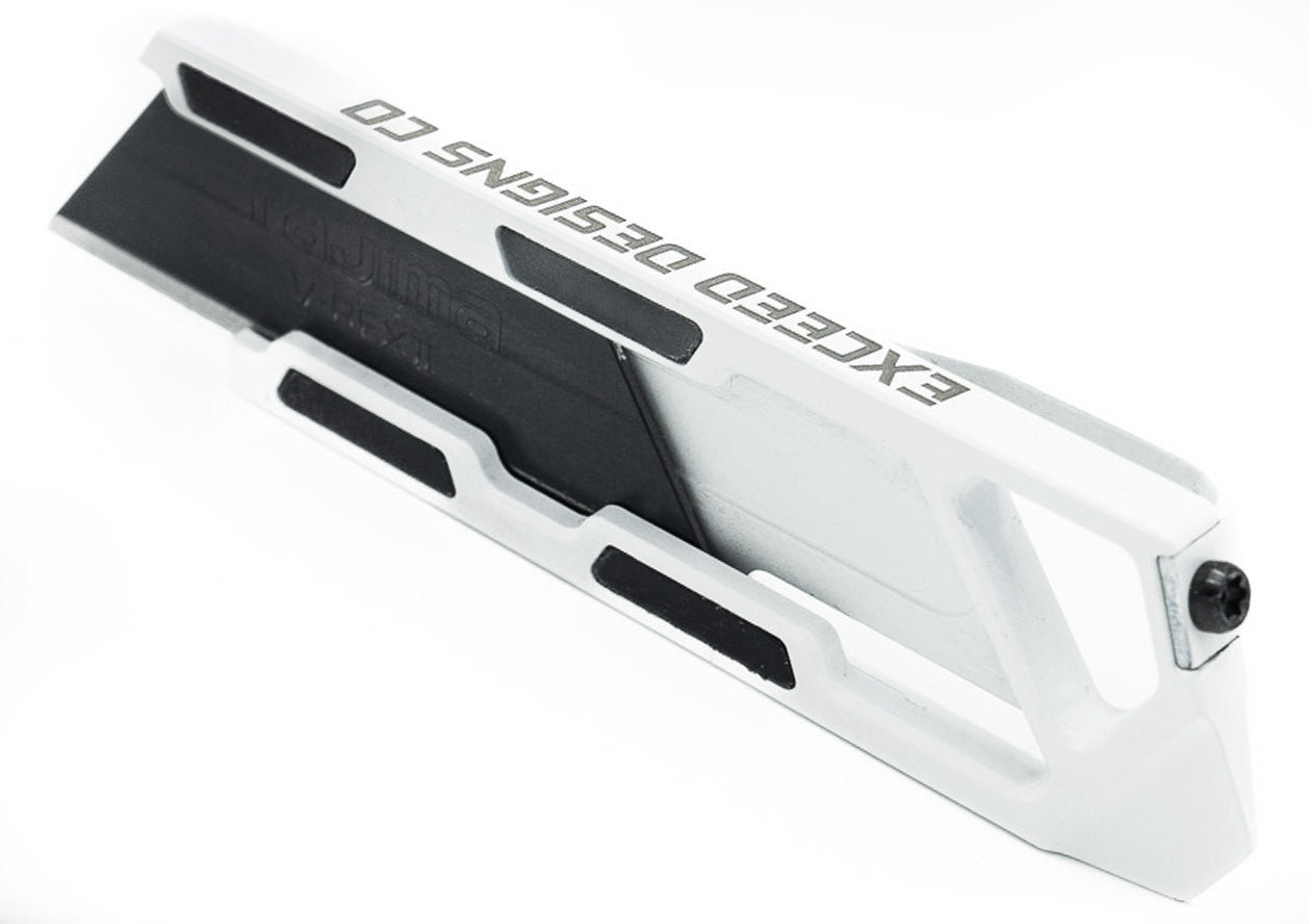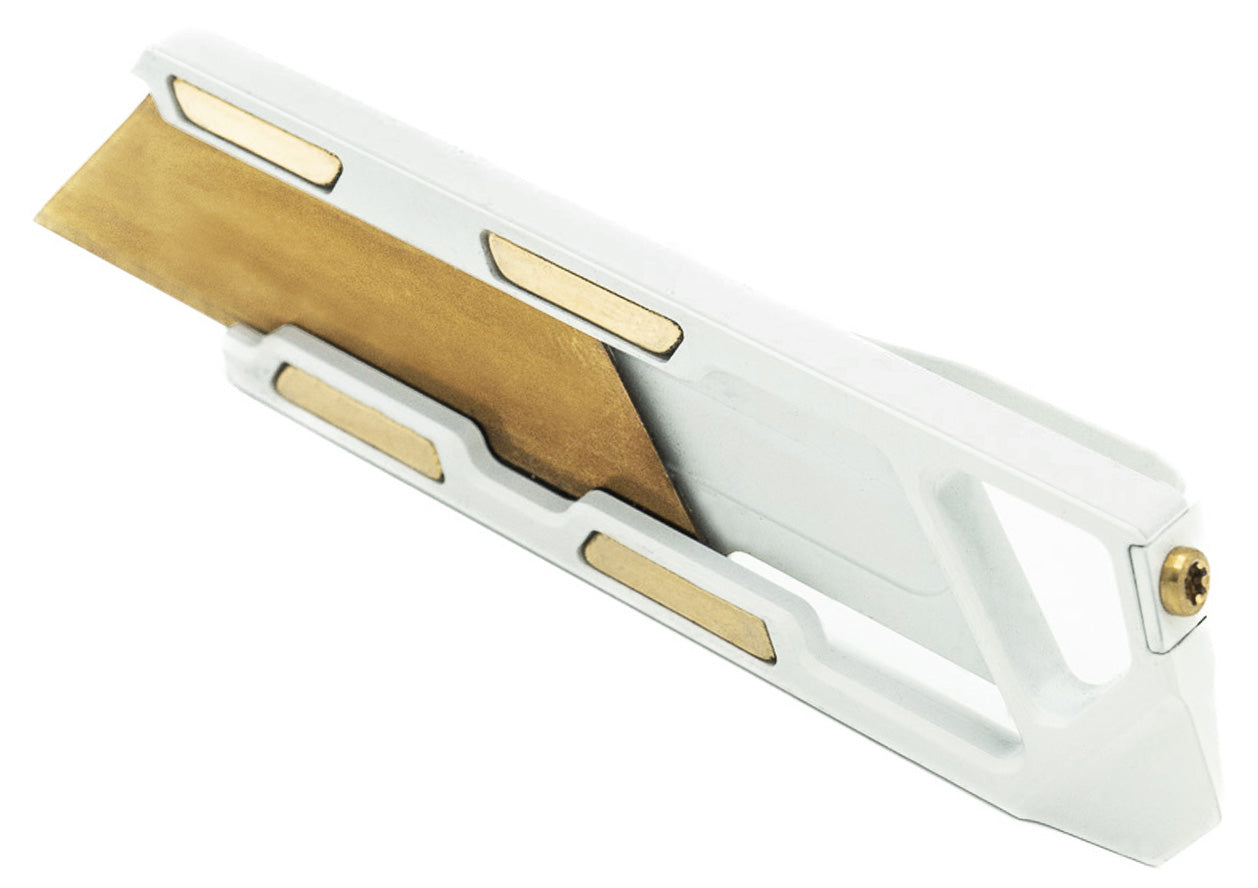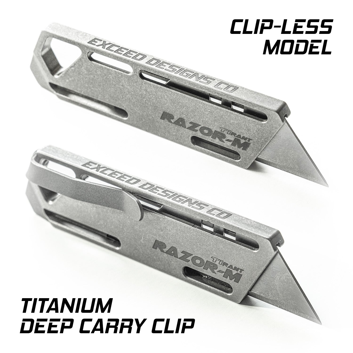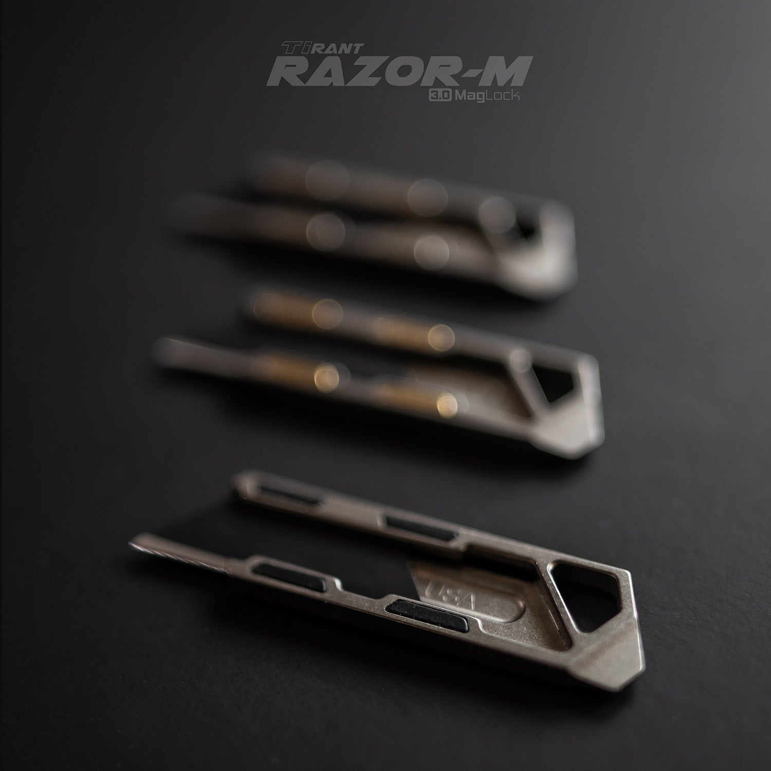 - This Exceed Designs ‘TiRant RAZOR-M 3.0 MagLock’ utility knife, (Titanium Magnetic/MagLock Utility Knife — TMUK) EDC pocket knife & pry bar is CNC milled from a solid block of 6Al-4V Titanium. The full titanium monoblock construction is built to last a lifetime and features our own custom magnetic design with 4 N52 Rare Earth Neodymium Magnets. These magnets give this one-of-a-kind utility knife a surprisingly addictive fidget factor. The ultra-light titanium design only weighs 0.6oz and nearly matches the thickness of just 2-3 home keys! This knife is available in stonewashed ti with optional magnet colors including Silver, Jet-Black and 24K Gold Coated. Each purchase includes 10X generic razor blades.